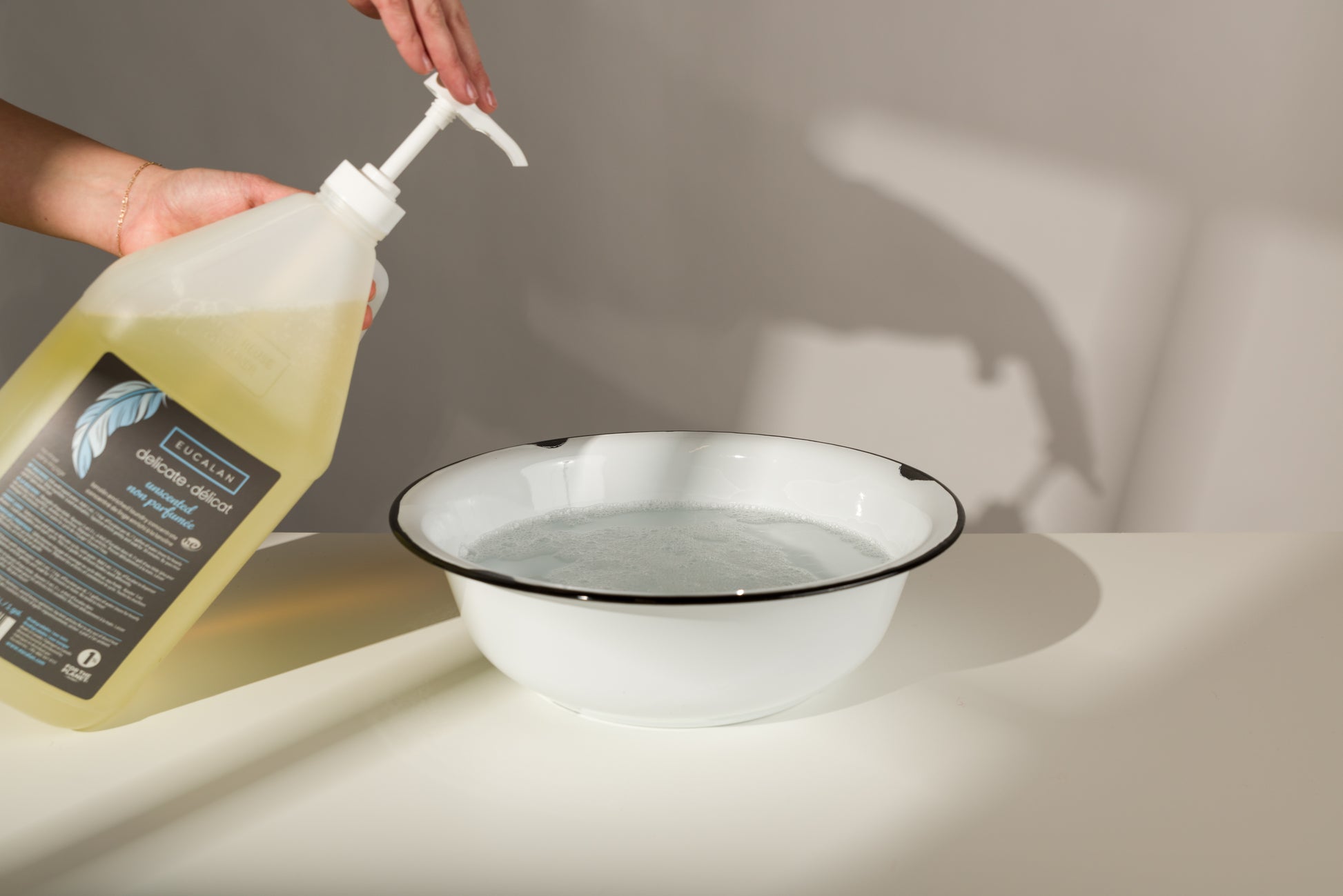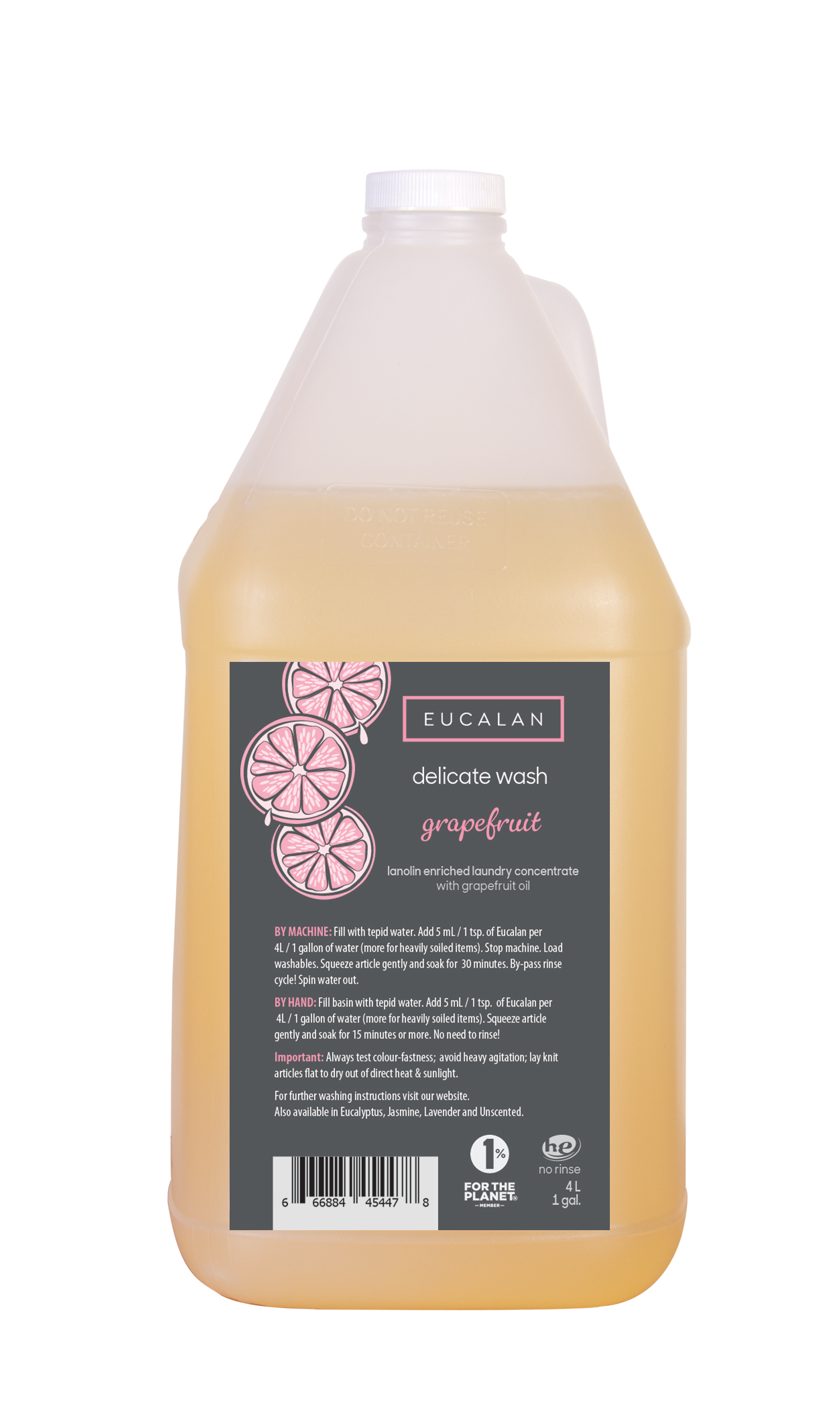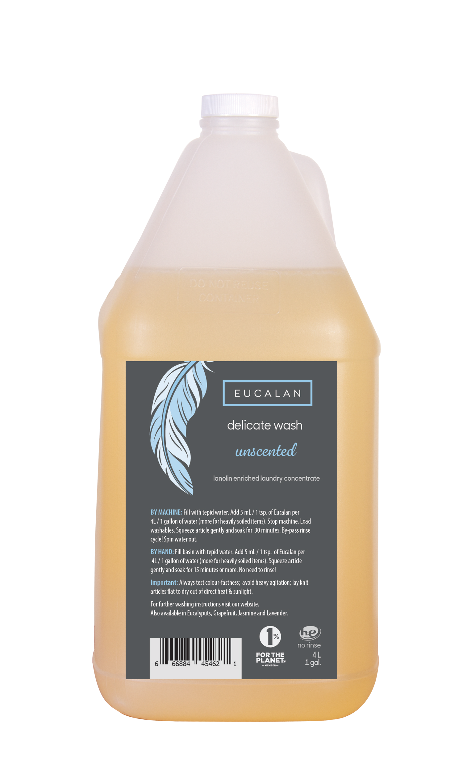 Eucalan is a no-rinse, pH-neutral delicate wash that’s non-toxic, biodegradable, and free of bleach, phosphates, synthetic fragrance, and dye. Packaged in a recyclable, dye-free HDPE plastic bottle and scented with pure essential oils—eucalyptus, lavender, grapefruit, jasmine, or unscented natural—it leaves fabrics clean, fresh, and soft.