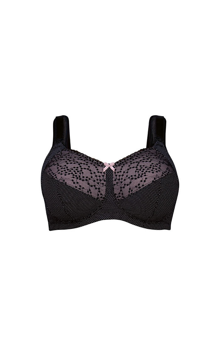 usts. This wire-free nursing bra features playful dotted lace along the neckline, a sweet mini dot print, and a delicate pink bow accent for a feminine touch.