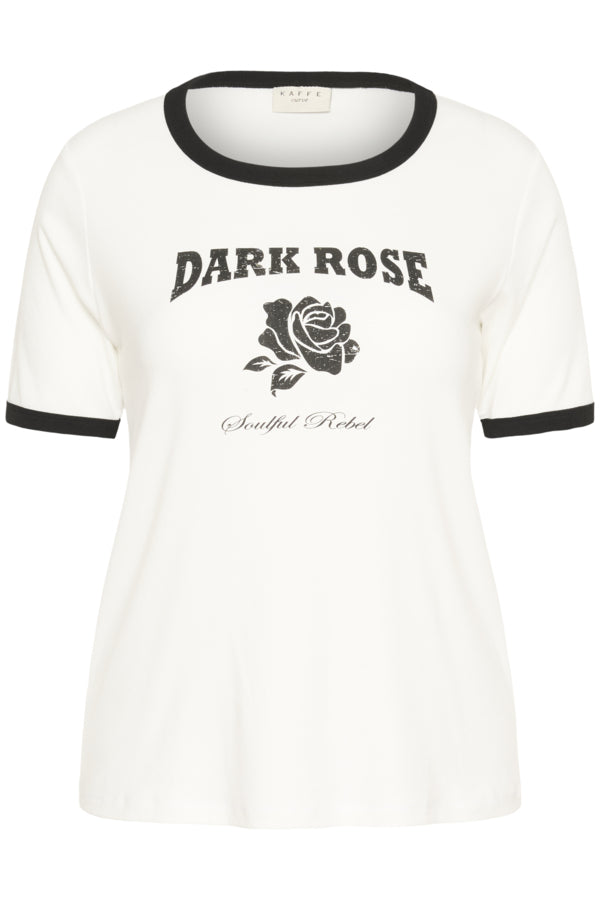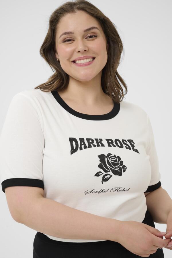 Effortless, comfortable, and just the right amount of edgy—this Olivie Graphic T-Shirt from Kaffe Curve is your go-to for everyday style with personality. Featuring a bold “Dark Rose” graphic and contrast trim, this tee brings a modern, slightly vintage vibe to your casual wardrobe.