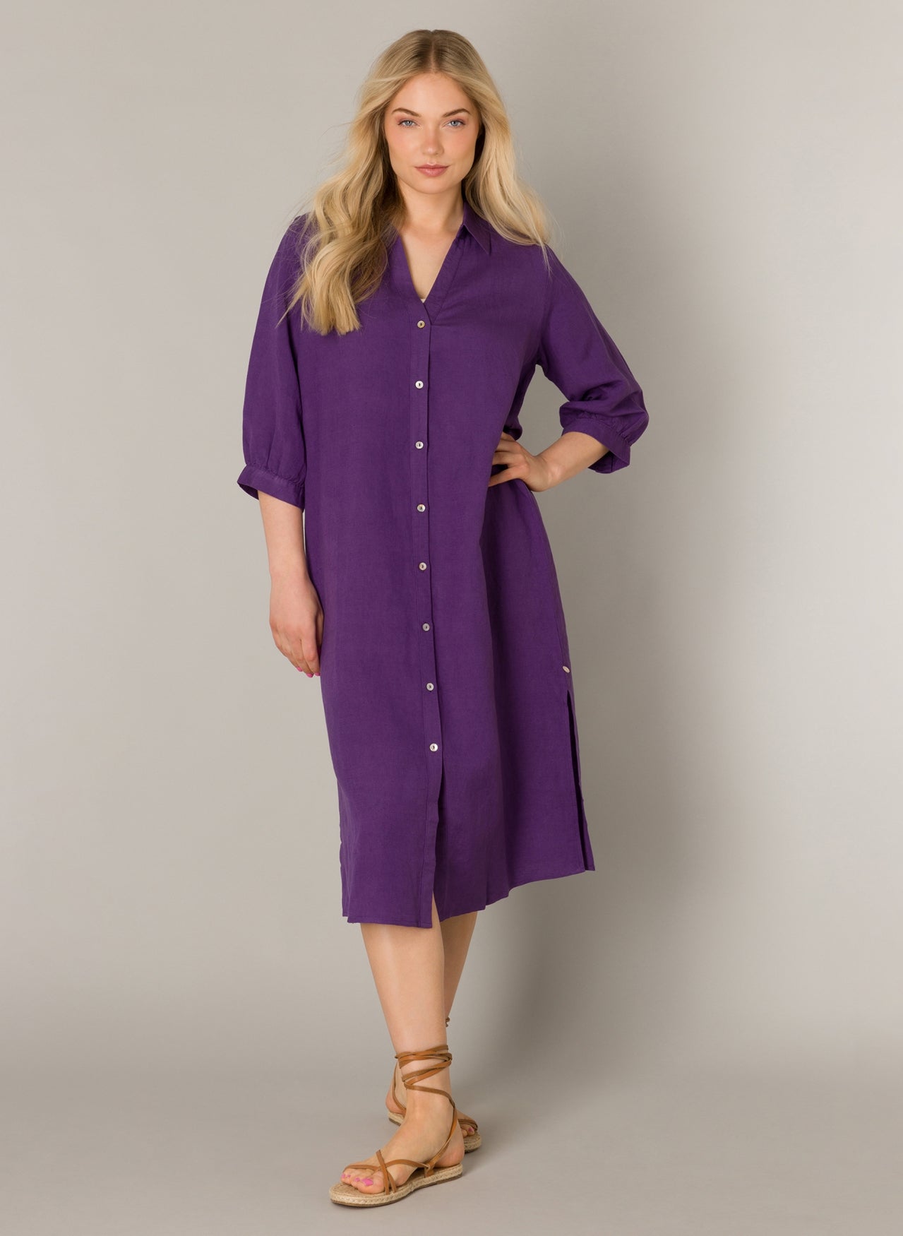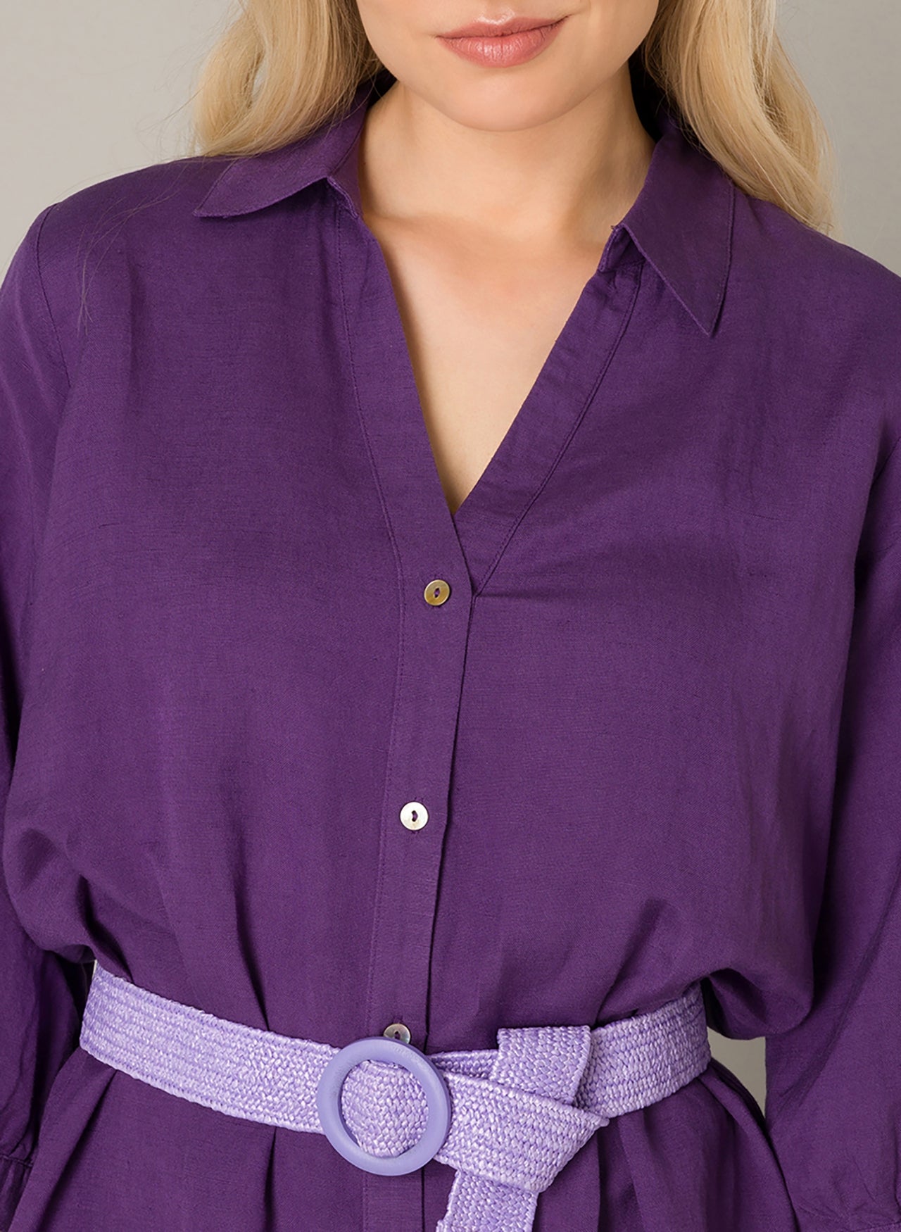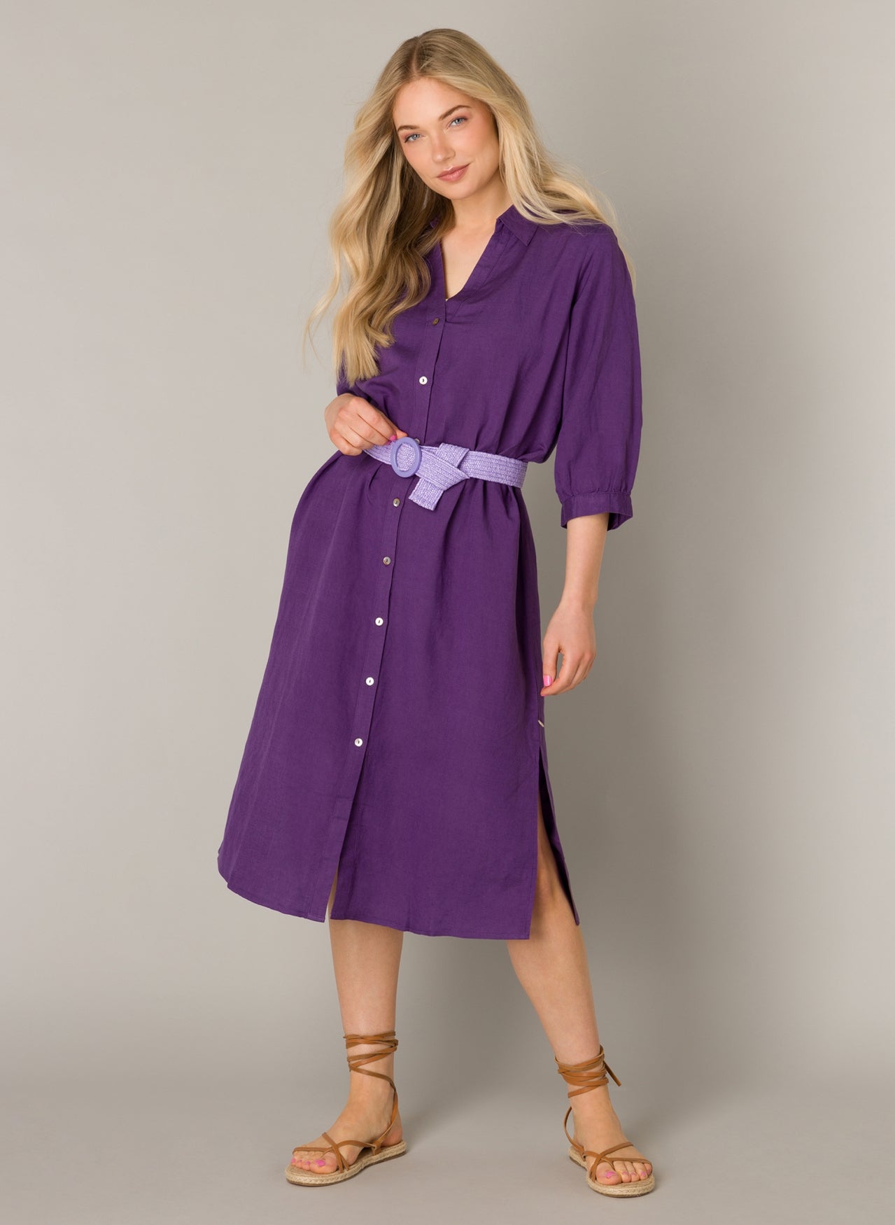 Embrace summer with this stylish linen/viscose dress! Featuring a straight cut, three-quarter sleeves, and slits at the sides, it's perfect for keeping cool and looking chic. You can wear it loose or cinch it at the waist with the included lilac belt. Stylish and versatile, this dress is a must-have for your wardrobe!